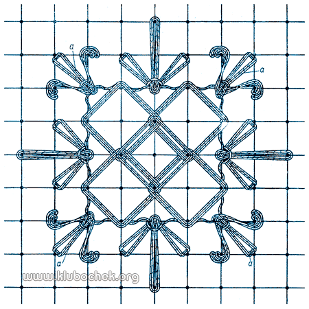 В ней вышито пять ромбиков, между которыми находятся лапки. По углам квадрата из 16 клеток вышиты фигурки а в виде усиков с листиком. Они вышиваются обвиванием горизонтального и вертикального столбиков клетки четырьмя нитками.